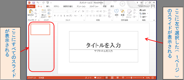 ① 左のスライドより追加したいページをクリック する(新しいページはクリックしたページの後ろに追加される