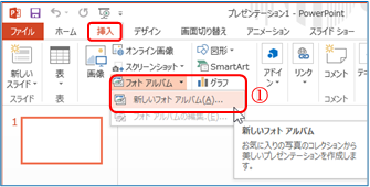 ① 「挿入」T⇒ 「画像」G⇒「フォトアルバム」Bの ▼⇒「新しいフォトアルバム」をクリックする