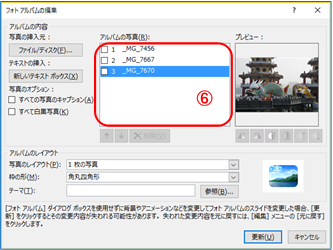 ⑥ 「アルバムの写真」に選択したファイルリスト が表示される