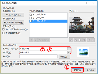 ⑦ 「フォトアルバムダイアログ」の下側「写真の