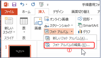 ① 「挿入」T⇒ 「画像」G⇒「フォトアルバム」Bの ▼⇒「フォトアルバムの編集」をクリックする