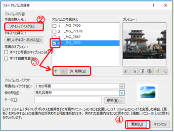 ③ 写真を削除するには、ファイル名の前のチェクボックスにチェックを入 れて↓↑で順番変更、「削除」Bで削除する