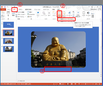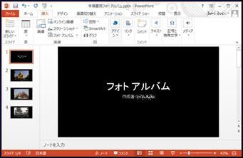 手順書「PowerPointで動画作成(その1)」で作成したPowerPointのファイルに手動で写真や文章などを追加することができる。