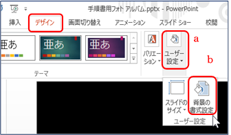 「デザイン」T⇒「ユーザー設定」Ba⇒「背景の書式設定」Bb を順にクリックする