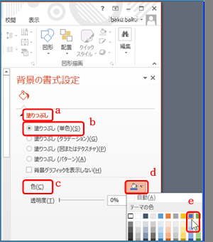 ③ 「背景の書式設定」が現れるので「塗りつぶし」a ⇒「塗りつぶし(単色)」b 左 の「◯」をクリックして選択⇒「色」c の右にあ る「ペンキ缶」マーク▼d ⇒お好みの色を選択す る。ここでは「テーマの色」の「青、アクセント5」e を 順にクリックする