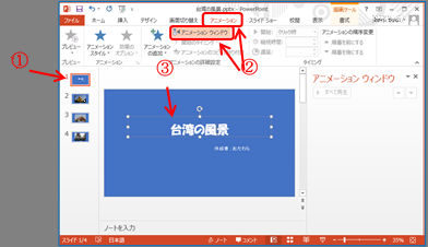 ② 「アニメーション」T⇒ 「アニメーションの詳細設定」Gの「アニメーションウィンドウ」Bを順にクリックする
