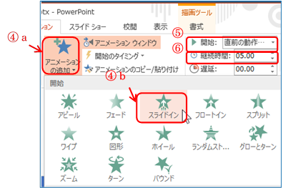 ④ 「アニメーションの追加」B a ⇒ 開始の「スライドイン」b を順にクリックする