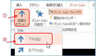 ⑦ 「アニメーション」T⇒「アニメーション」G⇒ 「効果のオプション」Bをクリックする