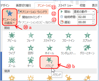 ⑩ 「アニメーションの追加」B a ⇒ 開始の「バウンド」b を順にクリックする