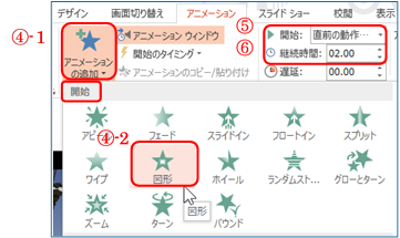 ④ 「アニメーションの追加」B⇒開始の「図形」を順にクリックする