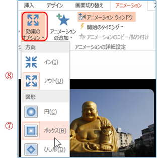 ⑦ 「アニメーション」T⇒「アニメーション」G⇒ 「効果のオプション」Bをクリックし、図形の「ボックス」をクリックする