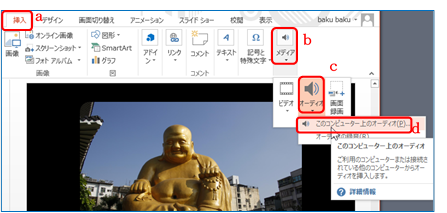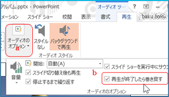 ⑨ 正しく音楽が挿入されているかを「6.動作の確認」を参照してスライドショーを実行