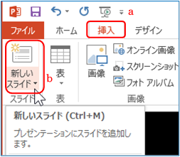 ② 「挿入」T a ⇒「スライド」Gの「新しいスライド」B b をクリックする