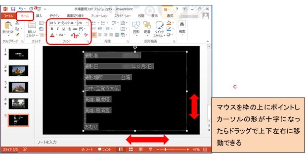 ③ 「ホーム」T a ⇒「フォント」G b で「フォントの種類」、「文字の大きさ」を設定し、テキストボックスをドラッグして位置を調整する c
