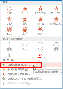 ② 「アニメーション」T⇒「アニメーションの詳細設定」G⇒ 「アニメーションの追加」B⇒「その他の開始効果」Bを クリックする