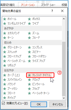 ③ 開始効果の追加ダイアログが現れるので「はなやか」の「クレジットタイ トル」をクリックして「OK」Bを クリックする