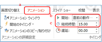 ④ 「アニメーション」T a ⇒「開始:」を「直前の動作と同時」に b 、 「継続時間:」を15秒に c 設定する