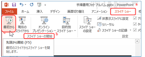 「スライドショー」T a の「スライドショーの開始」G b ⇒「最初から」B c をクリックする
