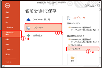 ① 「ファイル」T a ⇒「名前を付けて保存」b ⇒「コンピューター」⇒「デスクトップ」c と順にクリックする