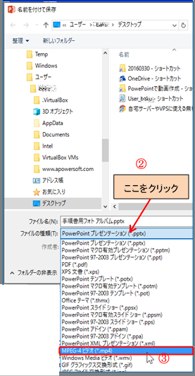 手順書(その1)の10.を参照してスライド ショーを動画ファイルとして保存する。