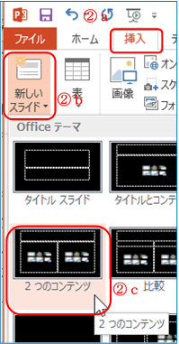 ② 「挿入」T a ⇒ 「新しいスライド」の右下▼ b 「2つのコンテ ンツ」 cを順にクリックする(下図)