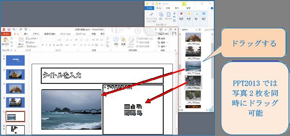 ③ 追加したい写真をマウスでドラッグして「新し いページ」の「テキストを入力」ボックス上にドラッグする
