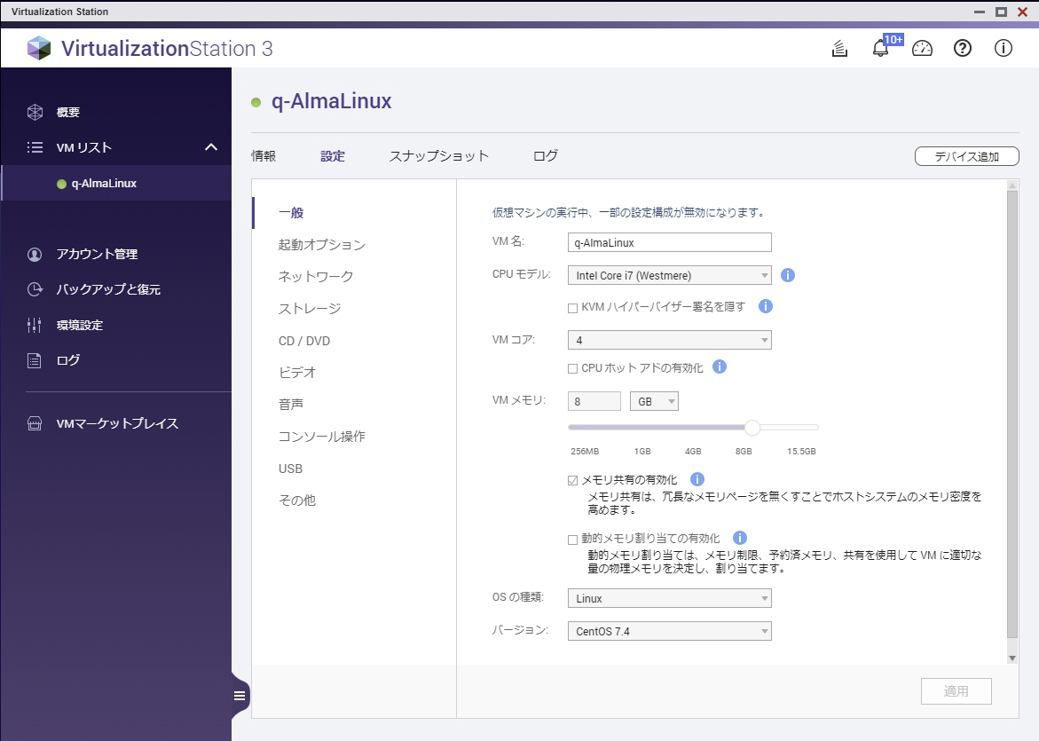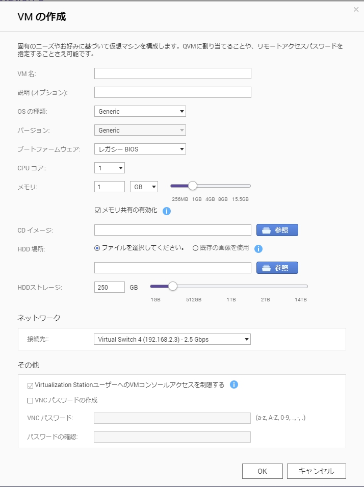 ・メモリ:"8GB"←物理メモリ16GBなので8GBにしたが2~4GBでもOK