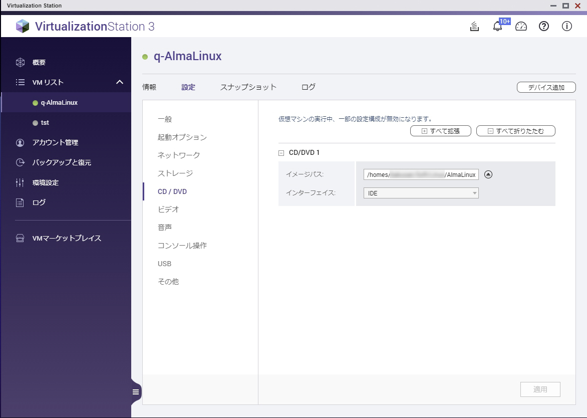 ・CDイメージ:"/homes...../AlmaLinux-9.3-x86_64-dvd.iso"←参照ボタンでセットする