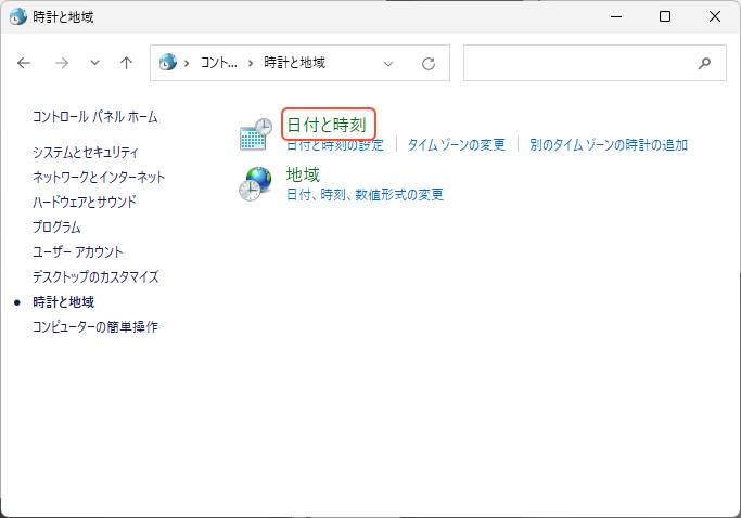 1-2-1.コントロールパネル→時計と地域→日付と時刻→「日付と時刻の変更」ボタンをクリック