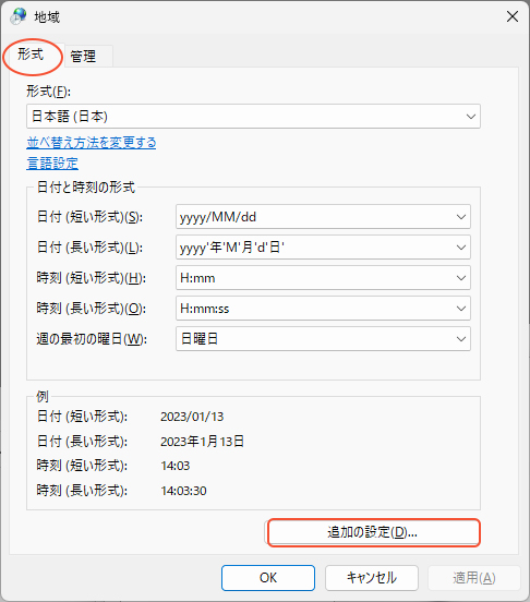 1-2-5.「地域」ダイアログが表示されるので「形式」タブ、「追加の設定」をクリック