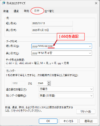 1-2-7.「データ形式」の「短い形式」のところの文字列「yyyy/MM/dd」の後ろへ「半角 スペース+ddd」を追記して「yyyy/MM/dd