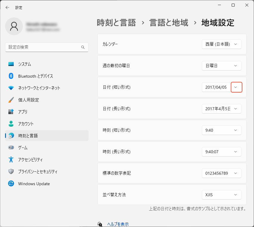 1-1-5.日付(短い形式)の右にある下向き V 記号をクリック→曜日の表示された項目を選択