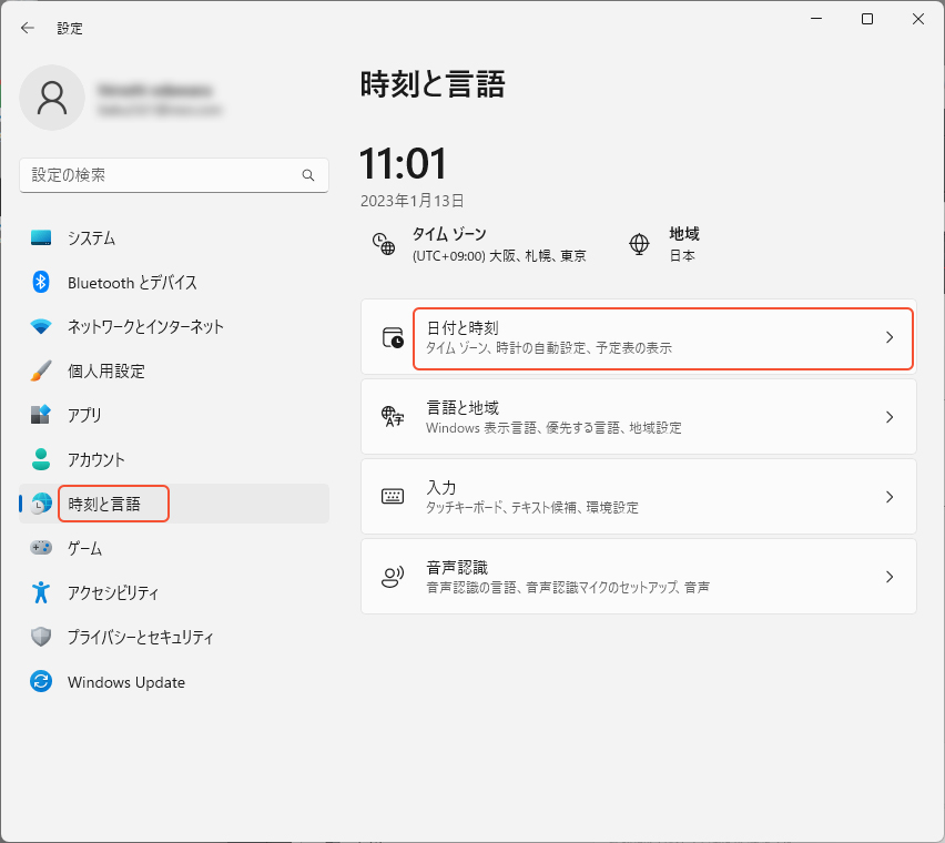 1-1-1.スタートメニュー→設定→時刻と言語→「日付と時刻」をクリック