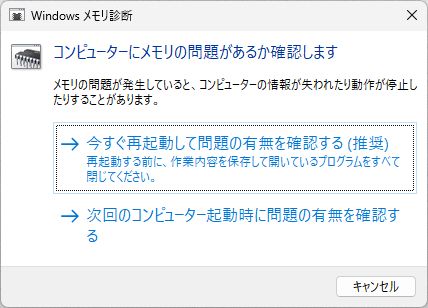 「Windowsメモリ診断」ダイアログが表示されるので、上側の「今すぐ再起動して・・・」をクリック
