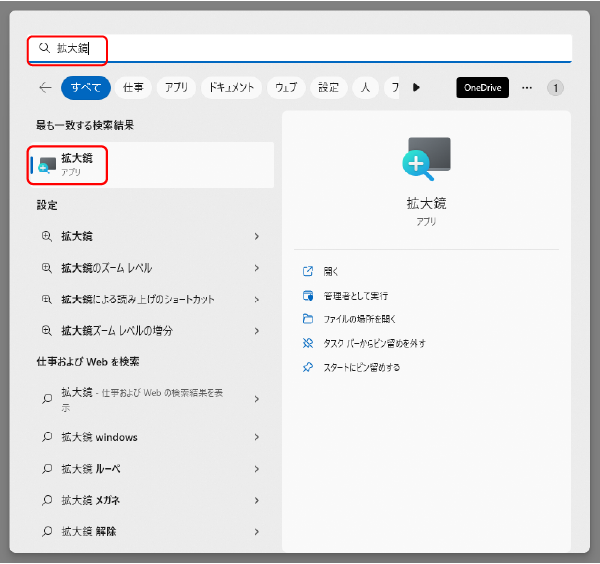 ・スタートメニュー→検索窓に「拡大鏡」と入力する。