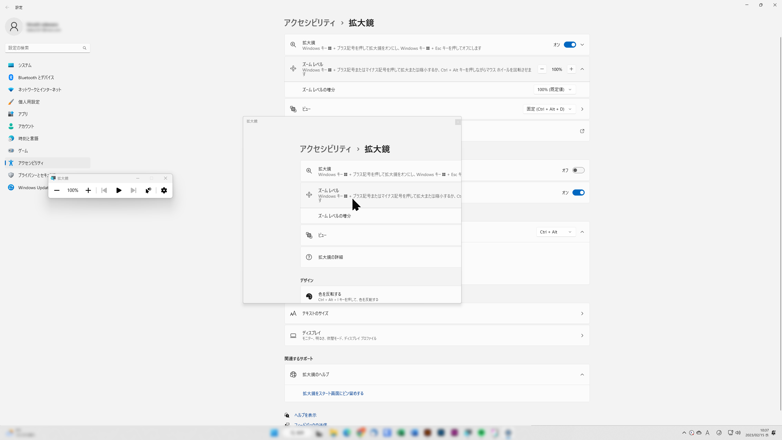 拡大鏡が画面全体に表示されているのでウインドウ表示に切り替える。