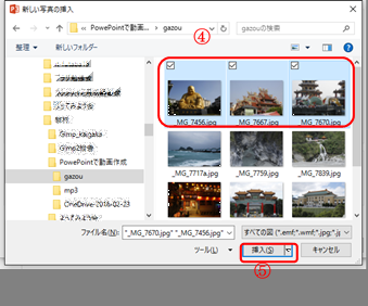 ④ 「エクスプローラー」が表示されるのでアルバム にしたい画像を挿入する(複数選択可能)