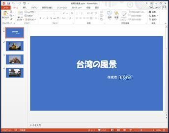 手順書「PowerPointで動画作成(その1)」で作成したPowerPointのファイルに手動で写真や文章などを追加することができる。