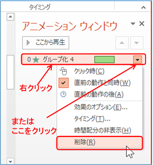 ⑤ 「タイミング」G⇒ 「開始:」の右側の▼で「直前の動作と同時」をクリックする