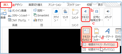 ① 「挿入」T a ⇒「テキスト」B b の 「テキストボックス」Bの▼c⇒「横書きテキストボックス」d をクリックする