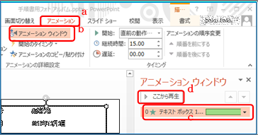 ⑥ 「テキストボックス1」c をクリックして「ここから再生」d で動作を確認する
