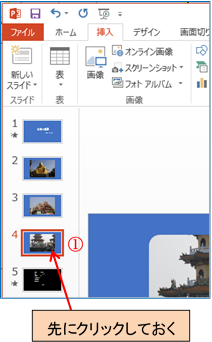 ① 左のスライドより追加したいページをクリック する(新しいページはクリックしたページの後ろに追加される