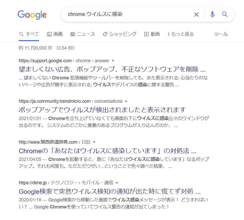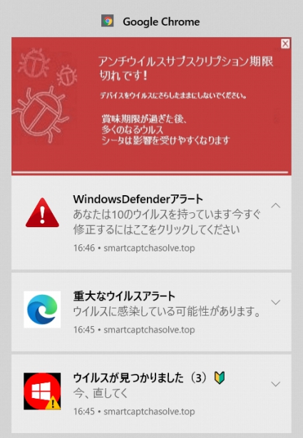 PC作業中にいきなり「重大なウイルスアラート、ウイルスに感染している可能性があります」という通知が表示された。