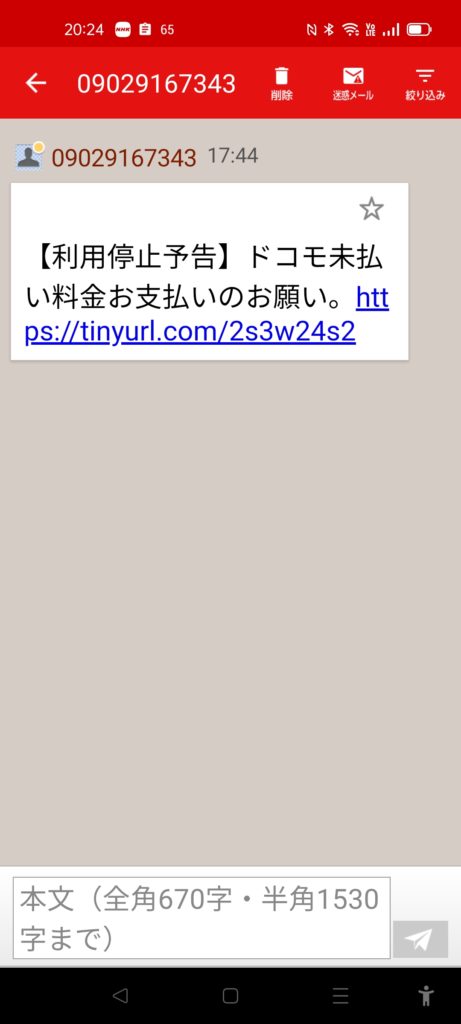 ドコモのホームページにも掲載されているが、「利用停止予告」というSMSが届いた。 フィッシング詐欺らしい。 リンクをクリックしないで削除した。 docomo契約者ではないので気づいたが、クリックするとdアカウントID、パスワードなど入力させられて盗まれるので気を付けたい。
