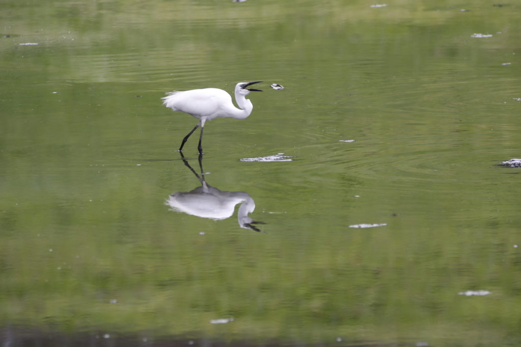 タンチョウ、まだ抱卵中。隣でシラサギが・・・