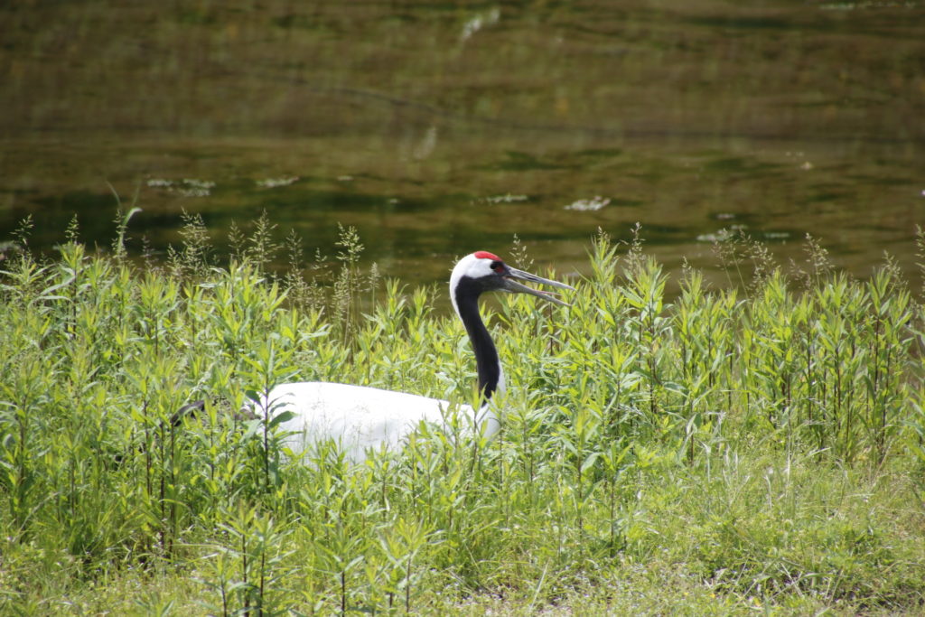 早朝、抱卵中の親丹頂は眠っていた。珍客(ヌートリア)も現れた。