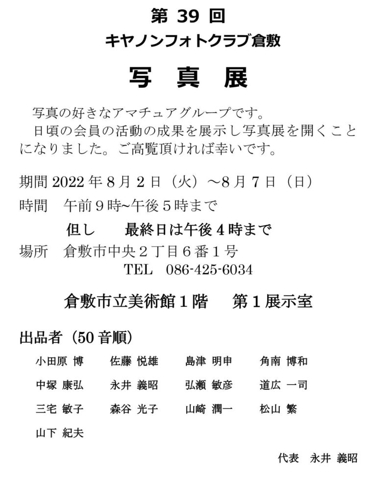 投稿日: 2022年6月9日2022年6月9日倉敷フォトミュラル 昨年応募したので今年も応募案内が来た。テーマ:「ねこ」「ときめき」応募受付期間:2022年7月22日~8月22日詳細は、ホームページ参照となっているが、現時点ではまだ掲載されていない様子。