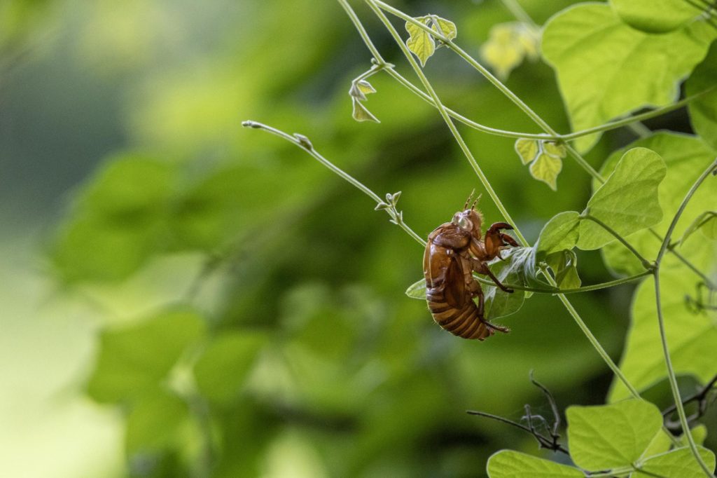 撮りに行ったが当日朝の大きな草刈り音で親鳥現れず。セミの抜け殻とモニターに映った雛鳥を眺めて帰る。