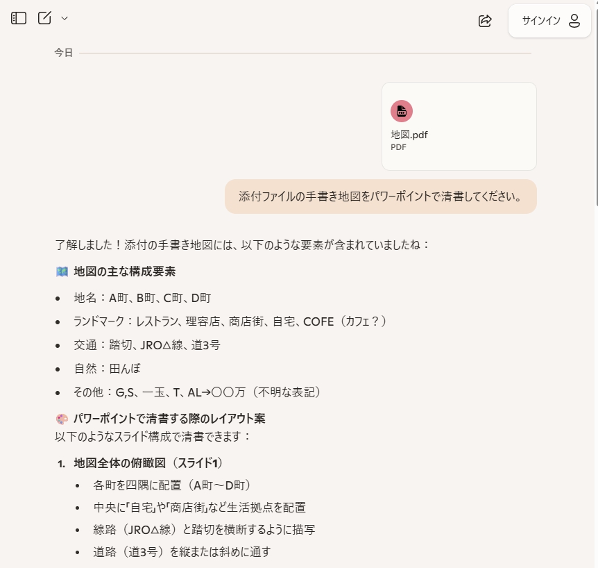 「添付ファイルの手書き地図をパワーポイントで清書してください。」