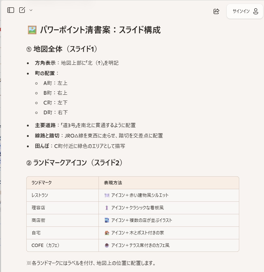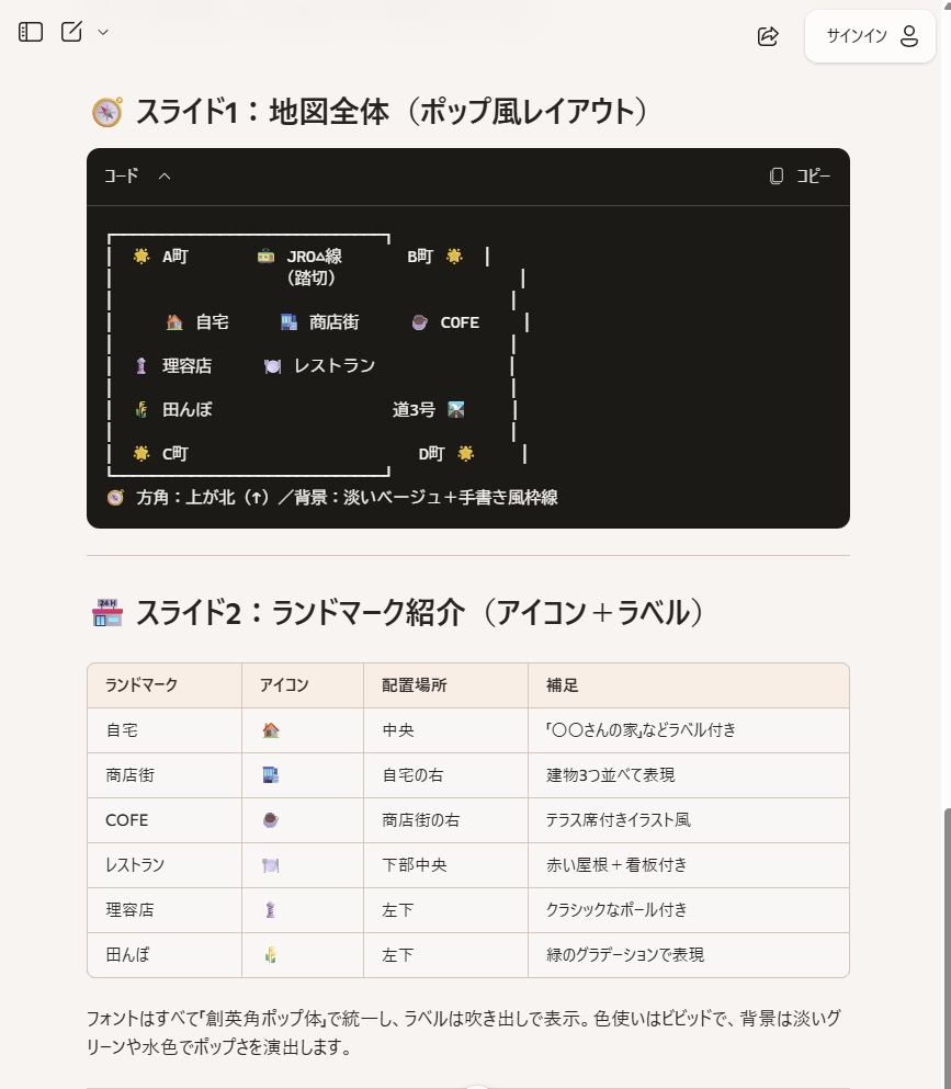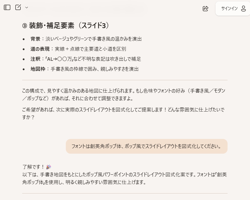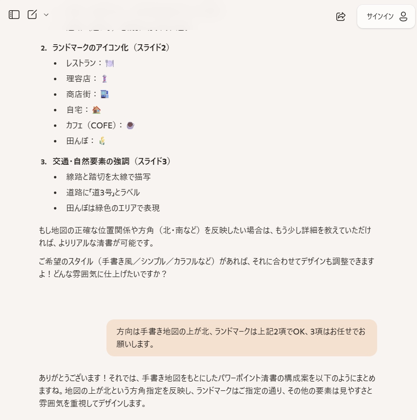 色々と細かな情報を聞かれ、提案はしてもらえたが最終的に仕上がった地図の作成まで至らなかった。以下やりとりのスクショ。